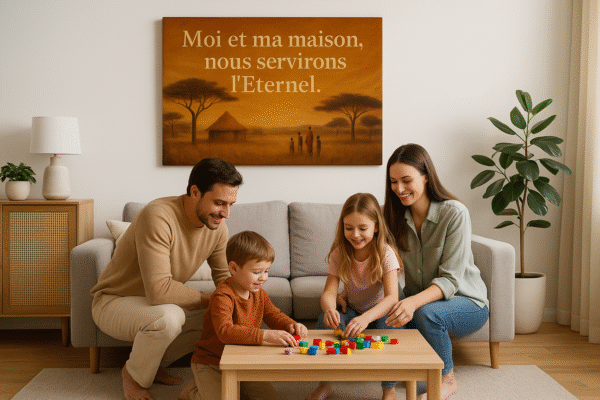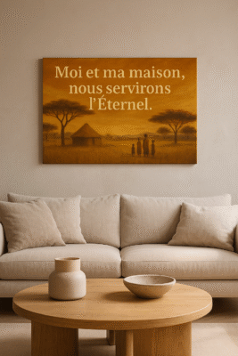 Au centre du ciel, le verset de Josué 24:15 se dresse comme une promesse : « Moi et ma maison, nous servirons l’Éternel. » Tu l’accroches, et soudain ton mur devient mémoire de ton engagement. Le texte n’est pas là pour faire joli : il bénit l’espace, il rappelle chaque jour le choix que vous avez fait, toi et les tiens, servir Dieu dans le concret de la vie, à table, dans le salon, au milieu des rires, des silences, des pardons.