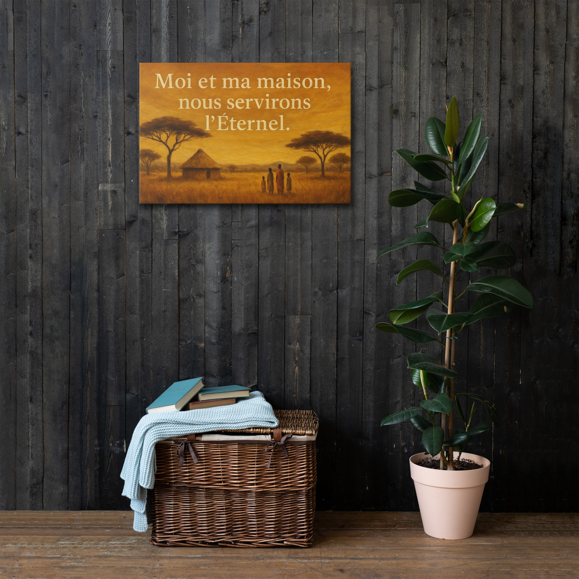 Le tableau biblique moi et ma maison met en scène le verset de Josué 24:15 dans une lumière ambrée : une famille en marche, la hutte du foyer et des acacias qui veillent, paix, chaleur et foi au cœur de la maison.